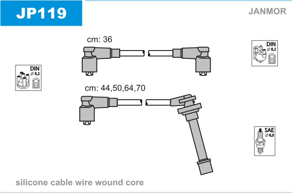 Дроти запалювання JanMor JP119, (комплект), Silikon, для NISSAN 100 NX 1,6 двиг. GA16DS, PRIMERA 1,6 / 1,6 I / 1,6 16V двиг. GA16DS, GA16DE, SUNNY 1,4 / 1,4 I двиг. GA14DE, GA14DS, 1,5 двиг. GA16DS, 1.6 I 16V 4WD/ 1,6 16V 4WD / 1,6 I двиг. GA16DS, GA16DE, VANETTE 1,6 I двиг. GA16DE
